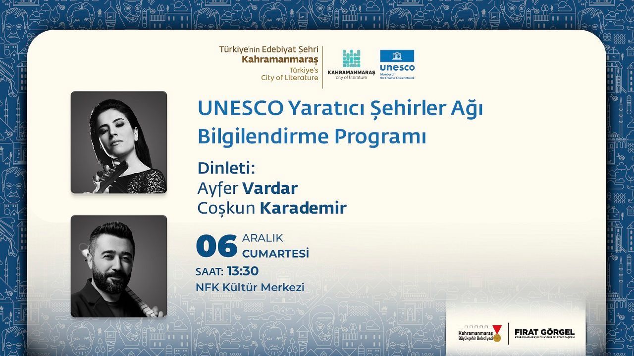 Kahramanmaraş Büyükşehir Belediyesi, sosyal belediyecilik anlayışı çerçevesinde kültür ve sanat etkinliklerini vatandaşlarla buluşturmaya devam ediyor. Türkiye’nin ilk UNESCO Edebiyat Şehrinde kültür sanat faaliyetlerini artırarak sürdüren Büyükşehir Belediyesi, Mevlâna İdris Kültür Sanat Sezonu kapsamında 6 Aralık Cumartesi günü saat 12.00’da Necip Fazıl Kısakürek Kültür Merkezi’nde UNESCO Yaratıcı Şehirler Bilgilendirme Toplantısı gerçekleştirilecek. UNESCO Yaratıcı Şehirler Ağı’na ‘Edebiyat’ alanında Türkiye’den dahil olan ilk şehir Kahramanmaraş’ın güçlü şairlik geleneği, edebi kimliği, ulusal ve uluslararası düzeyde görünür kılınması gibi konular toplantıda ele alınacak. Ayrıca programda sevilen müzisyenler Ayfer Vardar ve Coşkun Karademir’de müzik ziyafeti sunacak. Büyükşehir Belediyesinden yapılan açıklamada, bilgilendirme toplantısı ve müzik ziyafetine tüm vatandaşlar davet edildi.