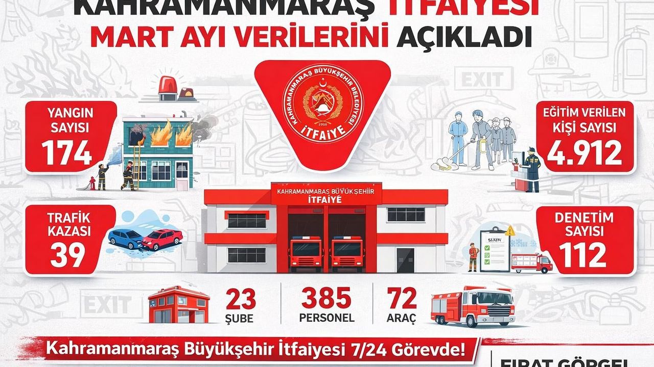 Kahramanmaraş Büyükşehir Belediyesi İtfaiye Dairesi Başkanlığı, 2026 yılı Mart ayına ilişkin faaliyet istatistiklerini kamuoyuyla paylaştı. Açıklanan verilere göre itfaiye ekipleri, ay boyunca toplam 445 olaya müdahale etti.