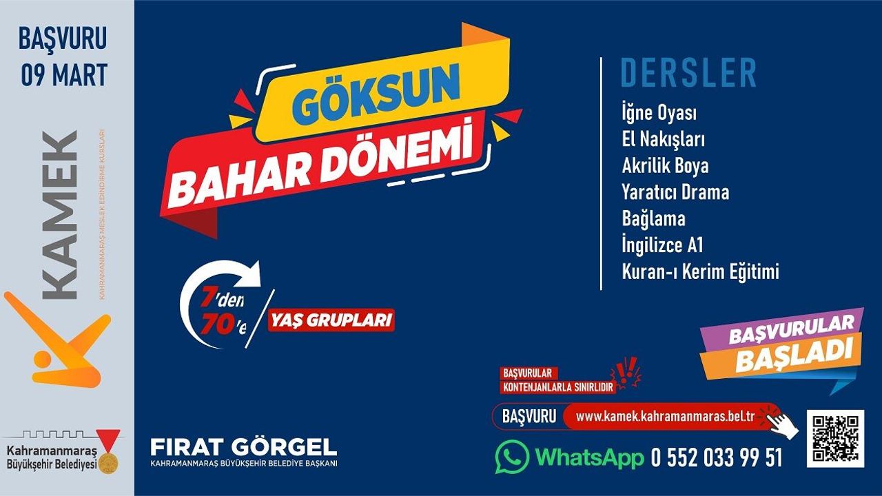 Göksun’da düzenlenecek KAMEK kurslarına katılmak isteyen vatandaşlar başvurularını çevrimiçi olarak gerçekleştirebilecek. Kayıt yaptırmak isteyenler, https://kahramanmaras.bel.tr/duyuru/2026/03/09/goksun-kamek-kurslari-basvuru-formu adresi üzerinden başvuru formuna ulaşarak işlemlerini tamamlayabiliyor.